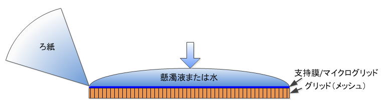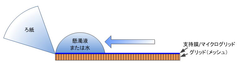支持膜(あるいはマイクログリッド)表面の親水化処理が適切になされている場合、懸濁液(あるいは水)がグリッド(メッシュ)全体を覆ったまま液層が薄く残るように“ろ紙”に吸い取られます。