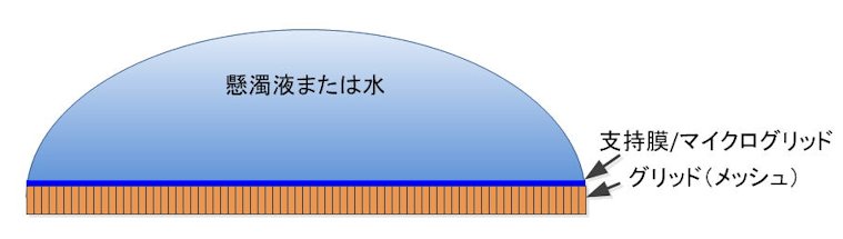 1.グロー放電により親水化処理された支持膜(またはマイクログリッド)上に懸濁液(あるいは水)がグリッド全体を覆うように載せます。